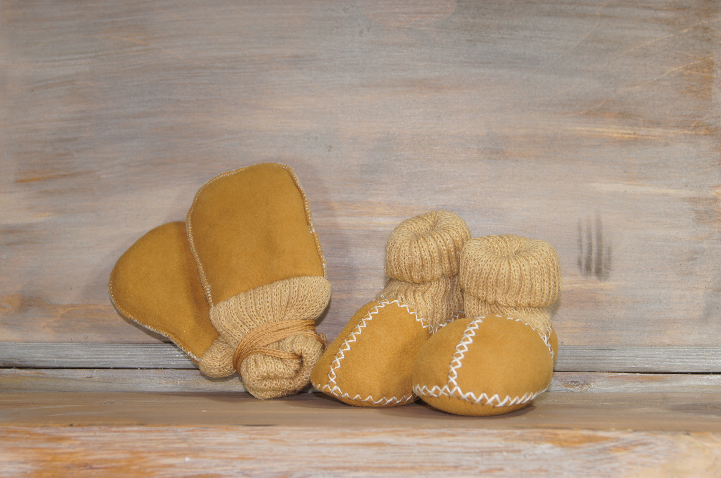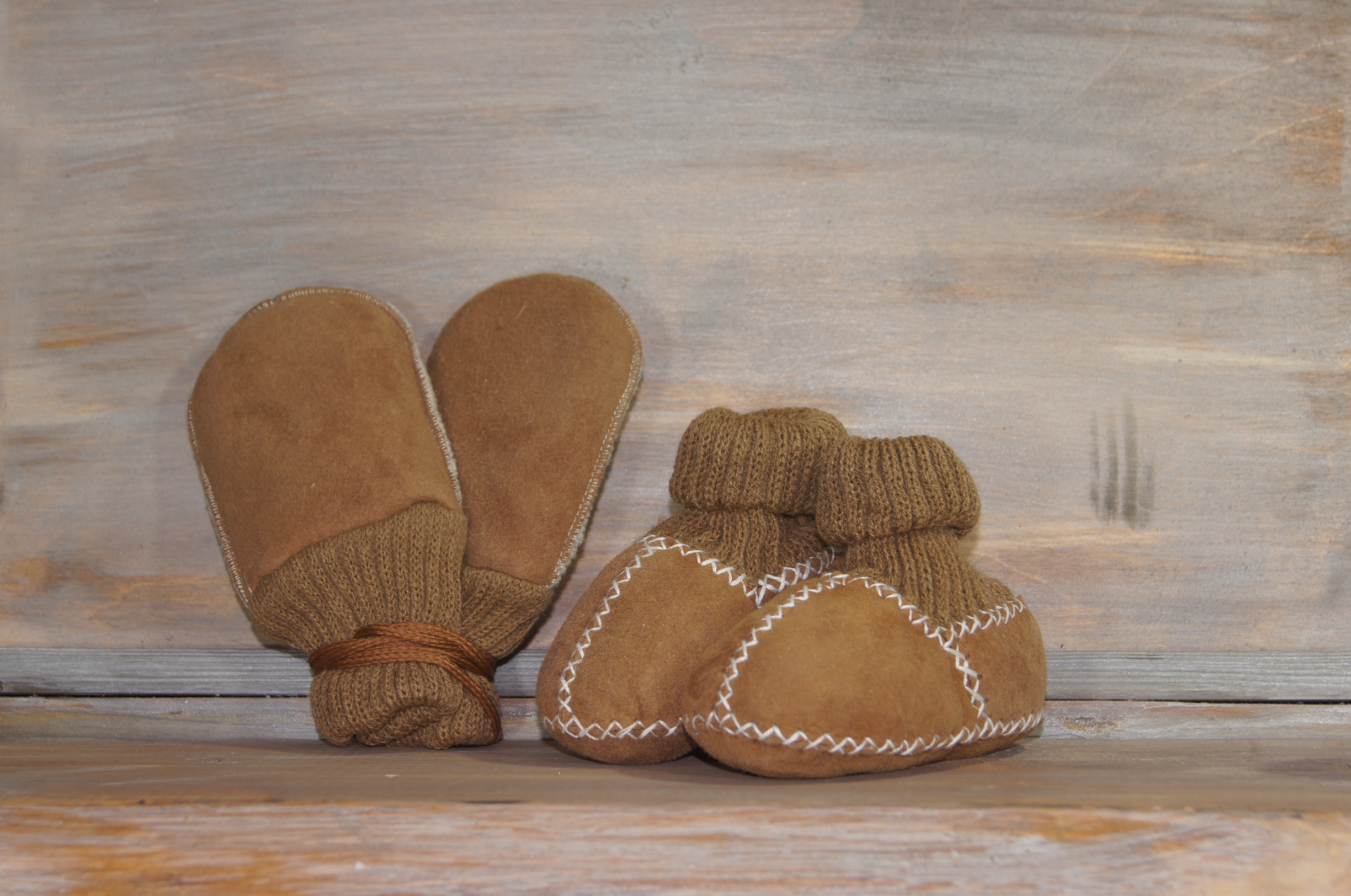 Buciki wykonane ręcznie. Wykończone pięknymi białymi obszyciami i ściągaczem w górnej części bucika. Rękawiczki wykonane z najlepszych skór jagnięcych, ciepłe i delikatne w dotyku. Posiadają ściągacz dzięki któremu nie zsuwają się dzieciom z rąk.